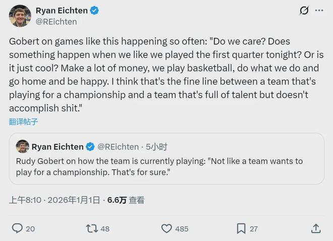 戈贝尔接着表示:“我们不像一支想要争冠的球队,这是肯定的。对于冠军球队来说,对手是谁并不重要,只在乎自己想要成为什么样的球队。我们应该去冲击冠军,每晚都要全力以赴,而不是成为一支天赋满满却一事无成的球队。”