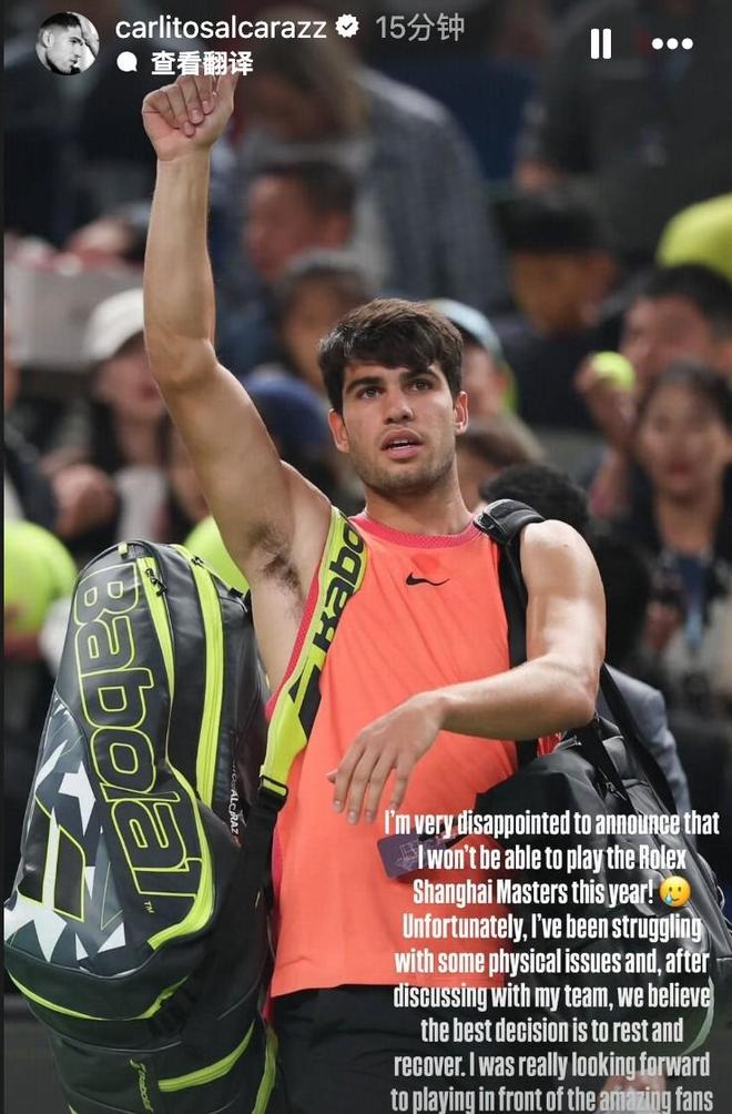 阿尔卡拉斯:受伤病困扰决定休息和恢复,无法参加上海大师赛