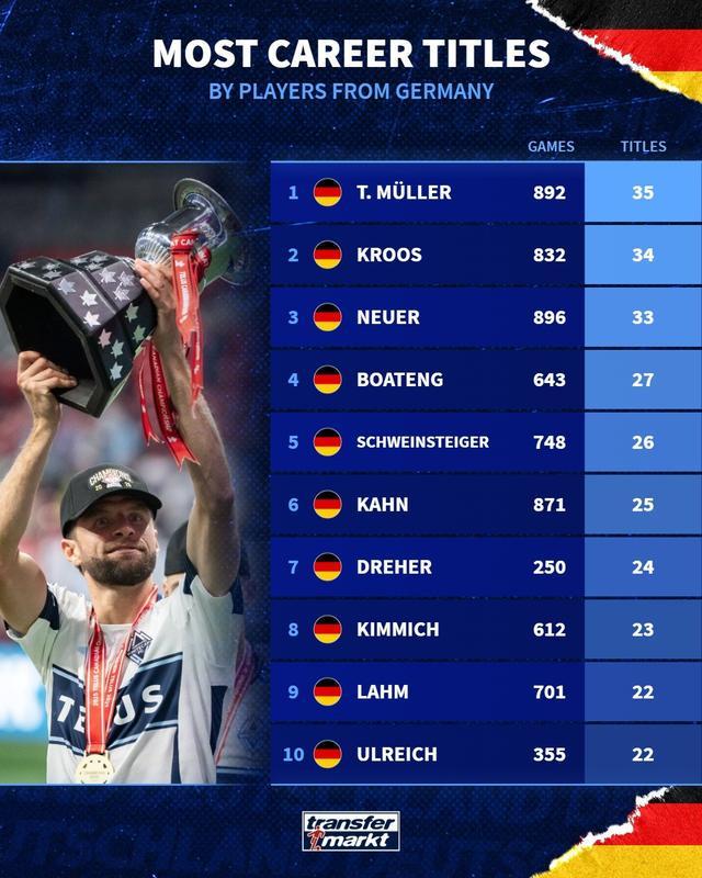 35冠超越克罗斯,穆勒成为夺冠次数最多的德国球员