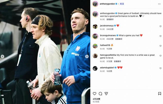 在与切尔西2-2战平的比赛后,纽卡前锋安东尼-戈登更新了个人社交媒体,其中的一张配图引起了球迷们的注意。