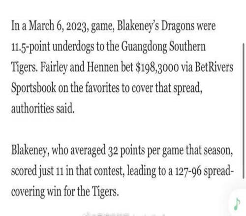 值得一提的是,法院文件披露,布莱克尼还拉拢了江苏队其他球员参与其中。2023年3月6日与广东队的这场对决里,其同伙投入了198300美元进行相关投注。那个赛季场均能砍下32分的布莱克尼,最终对阵广东队的这场比赛仅得到11分,最终成功让江苏队以96-127大比分不敌广东队,而布莱克尼团伙借此成功获利。