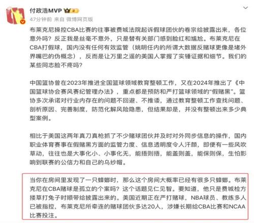 此次事件是美国媒体报道,美国这两年真刀真枪抓了不少赌球团伙并及时对外同步信息,此次抓到布莱克尼团队属于顺带披露,还不是专门侦察,作为对比,国内CBA公司并没有率先发现赌球、打假球的情况。 布莱克尼目前还在打球工作状态,只不过这两年没在CBA效力,本赛季在欧洲打球,此前他在告别江苏和南京两支队伍后一度有机会和上海大鲨鱼签约,但最终放鸽子不了了之。