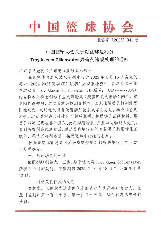 中国篮球协会13日宣布,对兴奋剂违规的中国男子篮球职业联赛(CBA)外援吉伦沃特处以禁赛3个月的处罚。 中国篮协在给广东东阳光队(广东宏远篮球俱乐部)下发的通知中说:“在国家体育总局反兴奋剂中心于2025年4月16日实施的赛内(2024-2025赛季CBA)兴奋剂检查中,你单位男子篮球运动员Troy Akeem Gillenwater(吉伦沃特)的A样本尿样检测结果呈大麻酚类(羧基四氢大麻酚)阳性。接到阳性通知后,运动员放弃检测B样本,因此该运动员检测结果阳性成立,表明运动员曾使用禁用物质或禁用方法,构成兴奋剂违规。运动员对该阳性作出了解释说明,并提供了证据材料。运动员能够证明在赛外摄入、使用禁用物质,并且与运动能力无关。接到兴奋剂违规通知后,运动员在规定时间内签署了结果管理回执单,承认兴奋剂违规,接受通知中指控的后果。” 根据国家体育总局《反兴奋剂规则》的有关规定,中国篮协对吉伦沃特做出了禁赛3个月的处罚,禁赛期自2025年10月13日至2026年1月12日。此外,广东东阳光队(广东宏远篮球俱乐部)作为管理单位受到了警告及负担20例兴奋剂检测费用(人民币36000元)的处罚,该单位的医疗与反兴奋剂负责人、队医林志达被给予警告处罚。 吉伦沃特,美国职业篮球运动员,在2024-2025赛季CBA常规赛中,吉伦沃特场均出战29.9分钟,场均贡献25.9分、7.3个篮板和2.0次助攻。 本文系观察者网独家稿件,未经授权,不得转载。 |