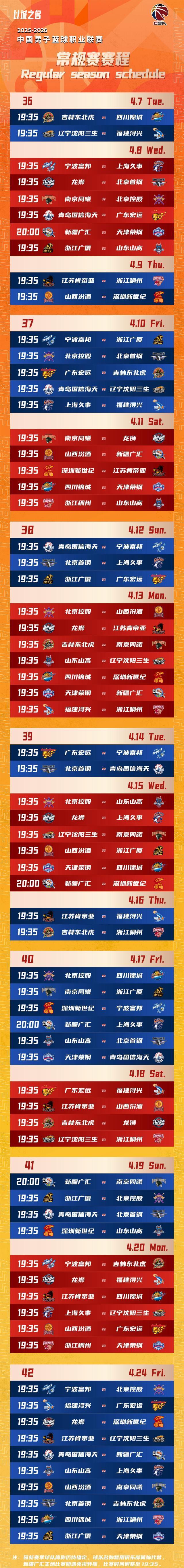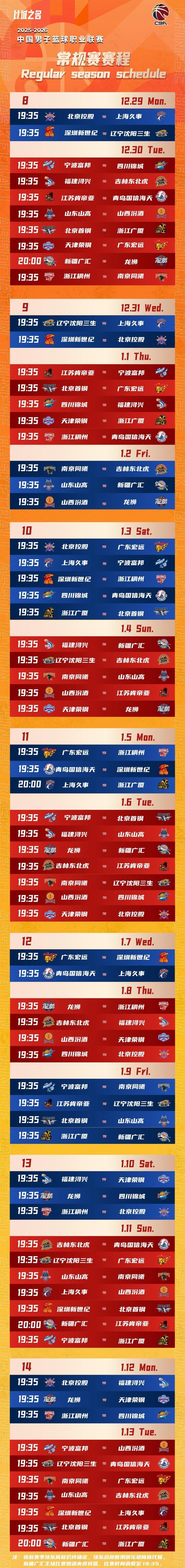 北京时间10月20日,CBA官方公布2025-2026赛季CBA联赛常规赛将于12月12日开赛,次年4月24日收官,具体赛程公布如下。 (注:由于目前新赛季球队全简称尚未确定,对阵表中球队名称暂用俱乐部简称代替。) |
