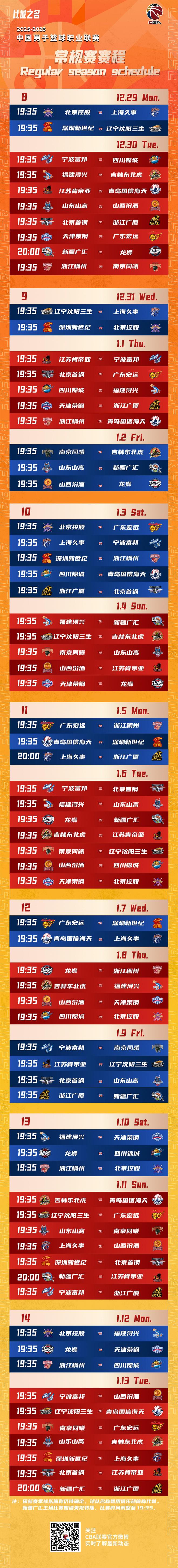 CBA2025-26赛季常规赛共42轮,揭幕战将于12月12日19:35开打,比赛为广厦主场迎战山西(上赛季常规赛前二)。