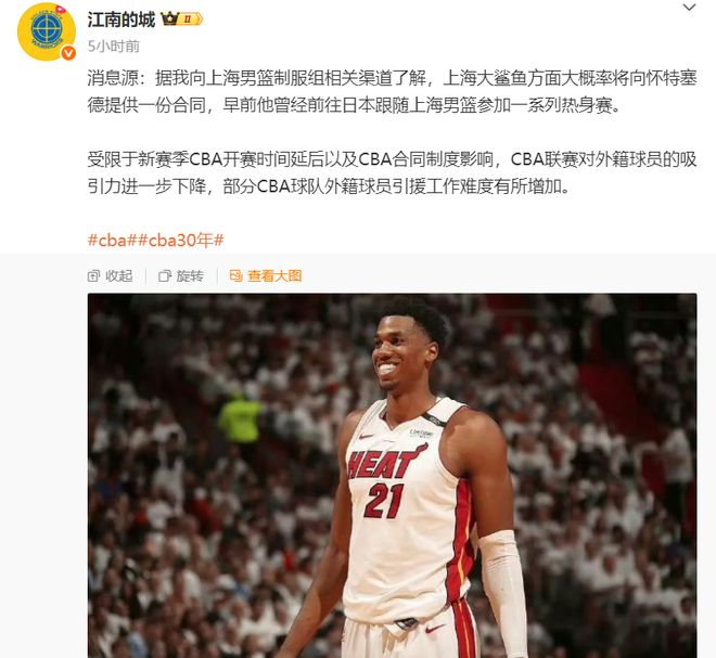 现在CBA大多数球员都在备战全运会决赛阶段比赛,但是新赛季联赛也将在12月份开打,各个队也都在开始签约外援。 据“江南的城”透露,上海男篮将会给前NBA球员怀特塞德提供一份合同,他曾入选NBA最佳防守阵容。