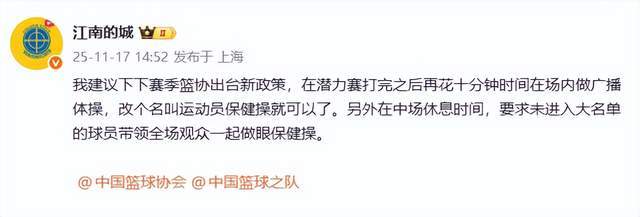 “江南的城”老师则连发2条动态,表达了自己的质疑,“潜力赛啊哈哈哈哈,职业篮球联赛还有第五节,下下赛季再加个第六节做完广播体操。”