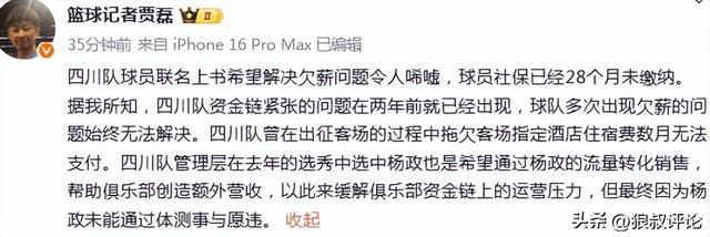 北京时间11月19日,根据篮球记者“贾磊的”报道,四川队球员联名上书希望解决欠薪问题令人唏嘘,球员社保已经28个月未缴纳。 据我所知,四川队资金链紧张的问题在两年前就已经出现,球队多次出现欠薪的问题始终无法解决。 四川队曾在出征客场的过程中拖欠客场指定酒店住宿费数月无法支付。四川队管理层在去年的选秀中选中杨政也是希望通过杨政的流量转化销售,帮助俱乐部创造额外营收,以此来缓解俱乐部资金链上的运营压力,但最终因为杨政未能通过体测事与愿违。 对于四川男篮和杨政之间合作,某种程度上是闹剧收场,这名大龄新秀在选秀前就公开表示,自己将会加入四川男篮。 选秀的结果也不出意外的话以次轮第一顺位被选中。 但由于CBA规则当中,不允许老将有免测条款,杨政作为非职业球员加入CBA联赛,首个任务肯定是通过CBA体测,但一个赛季折腾过去,杨政依旧未能通过CBA体测引发极大的争议,尤其是放弃体测的选择。 四川男篮也在官方声明当中提到杨政是“业余”球员等争议字眼,涉及到迟迟未能通过体测引发比较大的争议,甚至一度成为CBA选秀最大争议话题。 值得一提的是有消息称南京同曦俱乐部可能也会在新赛季走类似的思路,与年龄更大的网红街球手曹芳签下试训合同,这名34岁的老将若是征战新赛季的CBA联赛,他的正规合同可能就来到了老将E类合同。 根据CBA规则,年龄超过34岁的老将,将会获得签下E类合同资格,不算入工资帽。 |