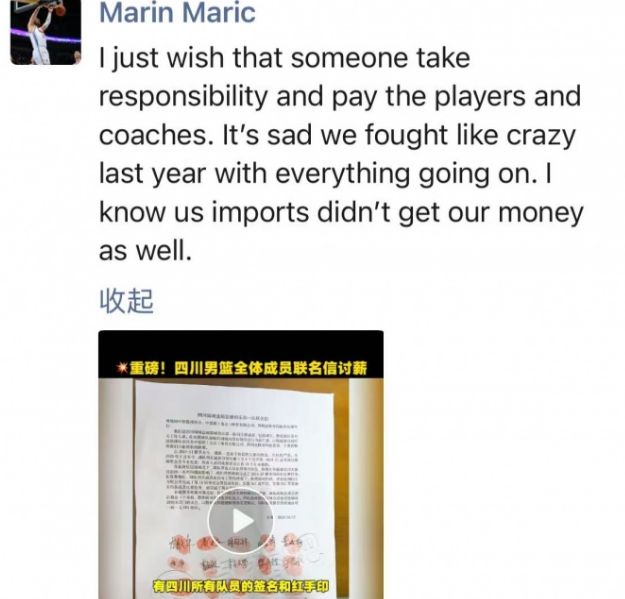 北京时间11月19日,在CBA新赛季已经来临之际,四川男篮球员、教练与工作人员联名信,向中国篮协、CBA公司和四川省体育局发布联名信,请求尽快解决四川男篮的长期欠薪问题。如今上赛季效力四川男篮的外援马里奇也通过社媒讨薪,表示四川男篮也欠了他们所有效力外援的薪水没有支付。