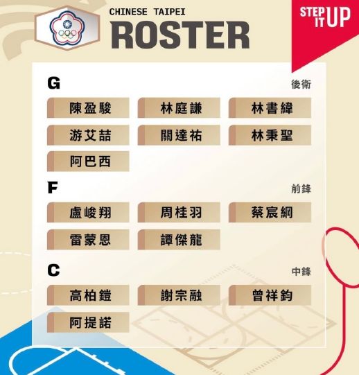 中国台北男篮世预赛第一窗口期大名单: 陈盈骏、林庭谦、林书纬、曾祥钧、谢宗融、阿巴西、游艾喆、卢峻翔、周桂羽、高柏铠、阿提诺、蔡宸纲、雷蒙恩、谭杰龙、关达祐。