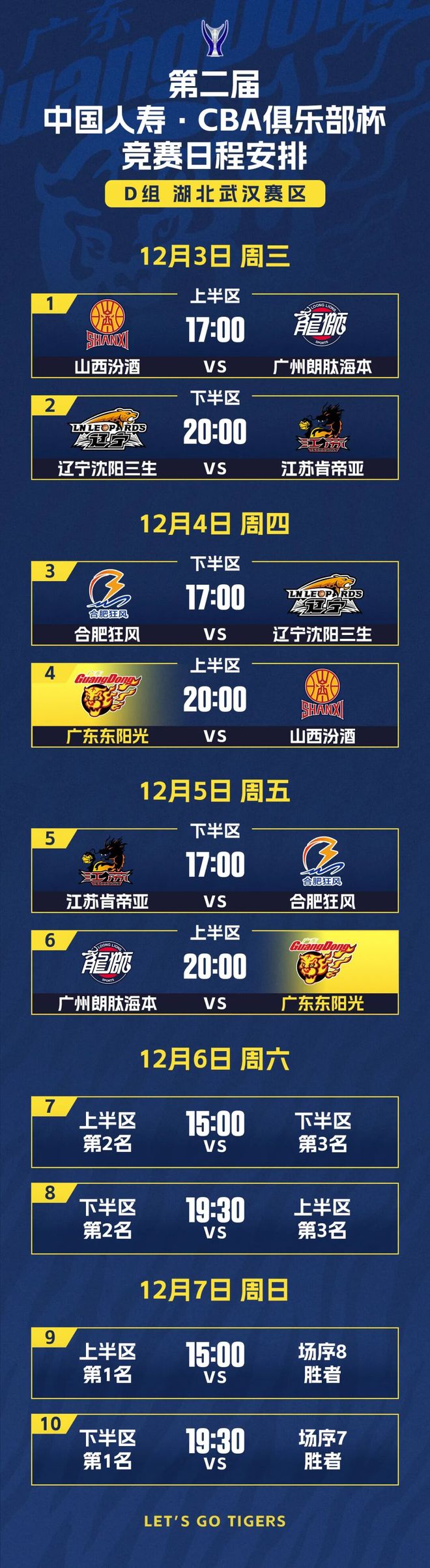12月3日-7日,第二届CBA俱乐部杯小组赛(湖北武汉赛区)在武汉洪山体育馆打响,广东东阳光男篮将先后与山西汾酒、广州龙狮交手,为最终决赛阶段参赛席位而战。同时,球队还将通过实战对阵容进行深度磨合,为即将到来的新赛季CBA联赛打下坚实基础。 作为新赛季CBA联赛前的重要赛事,本届俱乐部杯成为各队检验阵容、提升状态的关键练兵场。小组赛将于12月3日-8日分别在湖南长沙、江西南昌、广西南宁和湖北武汉四个赛区展开角逐,决赛阶段的比赛则将于2026年2月6日-12日在内蒙古自治区呼和浩特市举行。 广东队此次被分在湖北武汉赛区的D组,同组对手为山西汾酒、广州龙狮、辽宁沈阳三生、江苏肯帝亚,以及NBL联赛劲旅合肥狂风。比赛采取分区循环制:6支球队先按1、3、5号和2、4、6号分成上下半区进行单循环,根据单循环比赛排名再进行两轮交叉赛,小组积分排名前二的队伍晋级决赛阶段。 根据赛程安排,位于D组上半区的广东东阳光男篮,将在12月4日迎来首个对手山西汾酒男篮。强强对话,一触即发!以赛代练,以战促合!希望球队能够抓住这一磨合与演练阵容契机,通过比赛发现问题、解决问题,为新赛季积蓄能量! D 组 赛 程 安 排 |