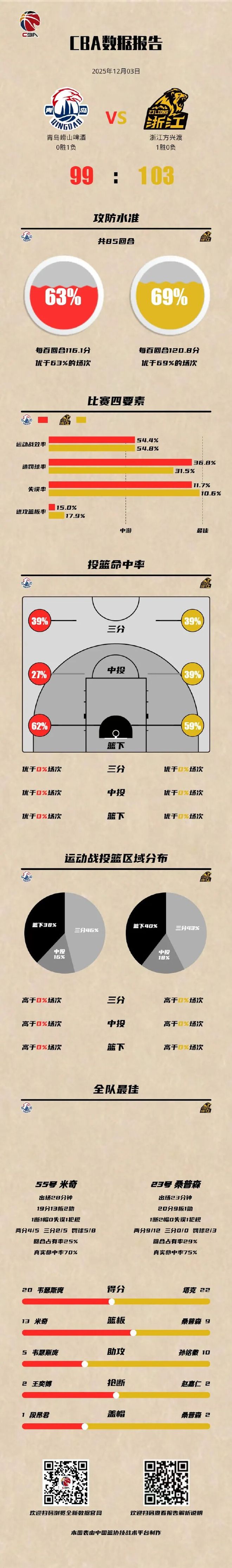 CBA俱乐部杯赛 北京时间2025年12月3日,第二届中国人寿·CBA俱乐部杯小组赛拉开战幕,青岛崂山啤酒迎战劲敌浙江方兴渡。比赛开局,双方你来我往,第二节后半程青岛崂山啤酒团队协作、立足防守,连续得分,将比分反超。进入下半场,浙江方兴渡调整状态、保持领先,战到最后,青岛崂山啤酒追分未果,最终99-103遗憾输掉比赛。