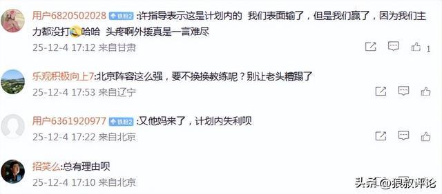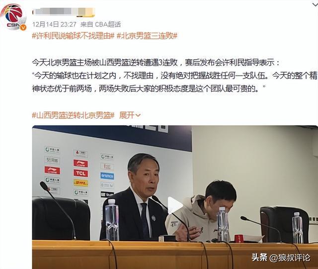 北京时间12月4日,CBA杯赛,北京男篮76-107不敌青岛男篮,作为一支外援到队时间比较早,且备战时间相对比较长的球队之一,第三节只得到10分,下半场合砍27分。显然是远远超出了外界的预期。北京阵容不乏翟晓川,方硕,张才仁等老将,也有顶薪球员范子铭坐镇。 赛后,许利民谈到北京男篮输31分的相关话题表示:这种情况是有预期的。球队阵容不整是现实存在的情况。现在北京队是一支全新的球队,应该一切从零开始,并且赛季开始后周琦、赵睿等人回来,还有可能会面临这样的情况。 有部分球迷觉得输31分太多了,完全没法匹配青岛的攻守转换,尤其是引进了斯佩尔曼后,不应该被打得溃不成军。 也有球迷调侃,输球的计划内又来了,我们表面输了,但是我们赢了,因为我们主力都没打,外援真是一言难尽。 为什么球迷这么多吐槽?实际与上个赛季许利民赛后各种“逆天言论”存在直接的关系。 24-25赛季,北京107-113不敌山东。赛后,北京主帅许利民出席了新闻发布会。提到北京男篮输球仍是胜利者引发球迷和媒体的热议。 许利民原话说道:“今天北京男篮比分虽然输了,但是我们是胜利者。真正的赢家是我们。 上赛季,北京男篮短时间内遭到山西双杀,以及不敌广东的新闻发布会,许利民的采访提到三连败仍在计划内。 不找理由,没有绝对把握战胜任何一支队伍。整个精神状态优于前两场,两场失败后大家的积极态度是这个团队最可贵的。 上赛季,北京男篮106-105战胜辽宁男篮。比赛结束后,北京男篮主帅许利民接受了媒体的采访。谈到本场比赛能赢球完全是靠运气才赢下比赛。 对方确实是冠军队,确实有底蕴,关键球处理,让我们学到很多东西。我们一直在向辽宁学习。 |