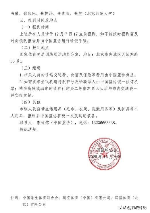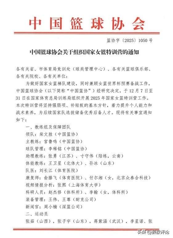 北京时间12月4日,根据媒体人“我爱女篮”的报道,中国篮球协会将于12月7日至31日组织国家女篮特训营,本次特训营将坚持强弱项、补短板的基本方针,着力提升个人能力和战术素养,为后续国家队选拔储备优秀后备人才。 本次名单以新生代球员为主,除张茹(山西竹叶青酒)外,包括张子宇(山东赤水河酒)、蒋紫涵(武汉盛帆黄鹤)、李星诺、张书璇、邵冰冰、张梓涵、李青阳、张笑(北京师范大学)等年轻球员。 目前正在参加WCBA联赛的国家集训队成员,将在联赛第11轮结束后(元旦后)与上述球员会合。 这一批球员也是以年轻球员为主,但是整体时间并不短暂,足足有3周左右时间,结合到没有正规比赛任务,是否能取得预期的锻炼价值,这就见仁见智了。 自从宫鲁鸣回归到中国女篮挂帅后,中国女篮集训时间明显进一步增加。 具体如下: 中国女篮集训队4月20日至5月18日前往昆明海埂进行高原训练,5月19日至6月10日返回训练局训练,6月上旬至7月上旬在国内进行6场热身赛,7月10日进入深圳赛区,为7月13日至20日举行的女篮亚洲杯作最后准备。 2025年8月18日至9月30日组织国家女篮夏季集训。本次夏训旨在进一步巩固和提升国家女篮整体竞技水平,重点强化运动员专项体能与个人技术能力。 针对当前优秀后卫人才短缺的现实情况,本次夏训将同时举办一次后卫训练营,力争为后续国家队选拔和培养优秀后备人才。国家女篮将于8月18日在昆明海埂训练基地集中,完成近4周高原训练后,转赴国内其他城市与来访的欧洲职业篮球俱乐部进行多场国际热身赛。 中国篮球协会将于12月7日至31日组织国家女篮特训营,本次特训营将坚持强弱项、补短板的基本方针,着力提升个人能力和战术素养,为后续国家队选拔储备优秀后备人才。 |