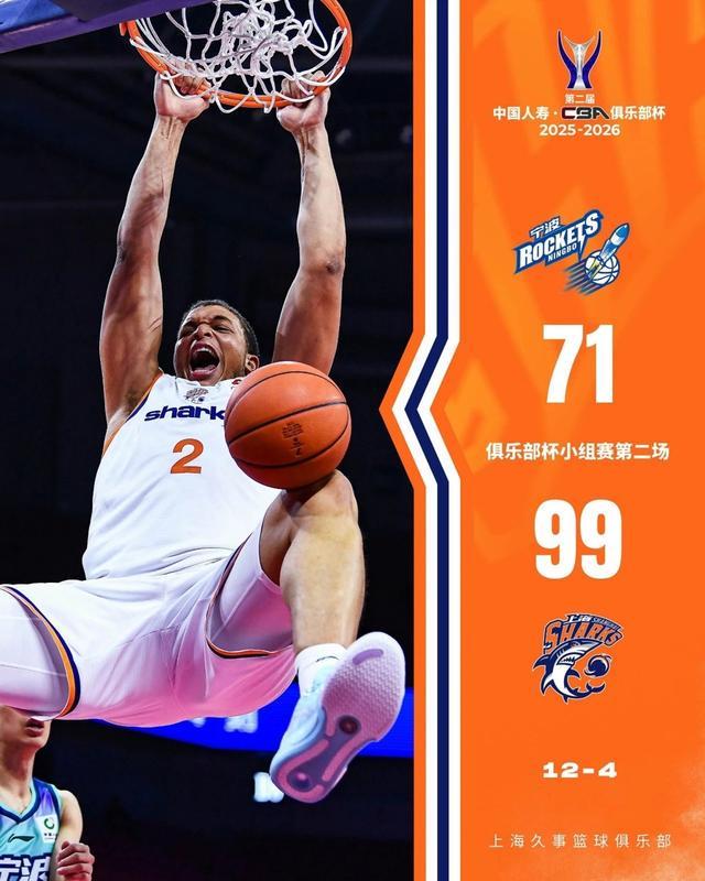 在第二届CBA俱乐部杯B组小组赛中,卫冕冠军上海久事男篮展现了强大实力。继首战以111比72大胜全华班出战的四川队后,该队在12月4日的第二轮比赛中背靠背出战,以99比71再胜宁波町渥队,强势收获两连胜。两场比赛,上海队男篮累计净胜对手高达67分,提前锁定B组上半区头名。 面对实力存在差距的宁波队,上海队此役对首发阵容进行了调整,由怀特塞德与李添荣顶替了王哲林与弗格首发。比赛从一开始就呈现出一边倒态势,首节李弘权和李添荣迅速进入状态,外线接连发炮,帮助本队迅速建立优势。尽管洛夫顿和怀特塞德出手不多,但替补登场的外援古德温连拿7分状态出色,王哲林与弗格也在登场后均有得分进账,首节结束上海队以28比20领先。