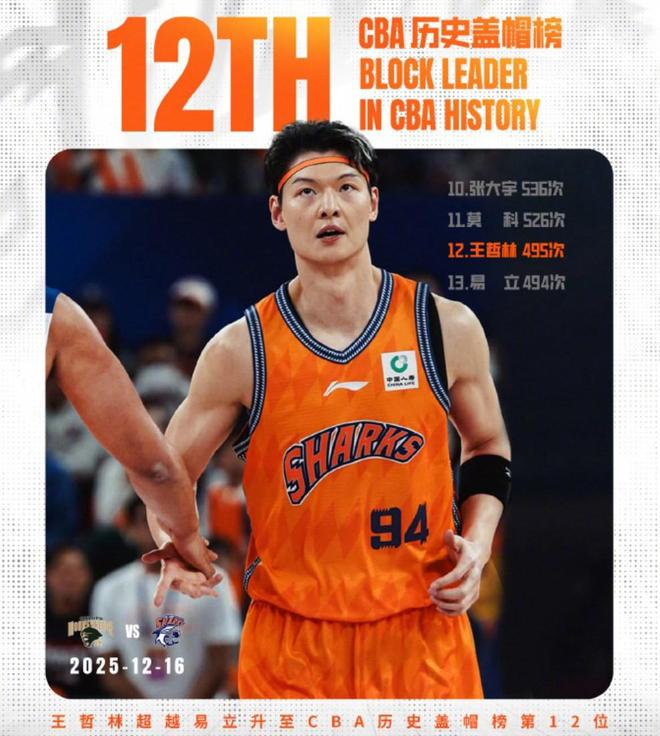 北京时间12月16日,2025-2026赛季CBA联赛常规赛第2轮,上海久事97-105不敌南京天之蓝。此役,王哲林超越易立,升至CBA历史盖帽榜第12位。