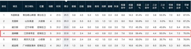 赛季至今,庞峥麟场均贡献22.8分3.6篮板4助攻0.8抢断,三项命中率分别是59.4%、50%和75%,在场均30.8分钟的出场时间里承担大量控球任务,却只有2.6次失误,完全可以接受。