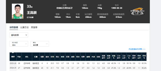 辽宁男篮第六人:王岚嵚 辽篮主力后卫赵继伟赛季开始前受伤,本赛季暂未复出。替补第六人王岚嵚临危受命,成为了球队临时首发后卫。25-26赛季六轮过后,王岚嵚全部首发登场。他称得上是五大豪门球队中,发挥最稳定的第六人。