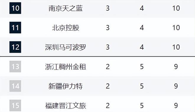 同曦、北控和深圳10-12,都是3胜4负,巩固住了附加赛的位置。同曦这轮艰难击败江苏,在郭昊文的带领下还是有可能晋级季后赛。北控艰难拿下辽宁,他们统治了关键时刻,终于止住颓势了。深圳这轮溃败广厦,确实实力差距很大。 13-14分别是浙江、新疆和福建,他们都是2胜5负。只是新疆目前已经四连败了,球队的困境还是没有解决,刘炜好像已经找不到什么办法了。浙江则在帅位之后的表现不错,外教的水平还是不错的。福建则溃败北京,还是实力上的问题。