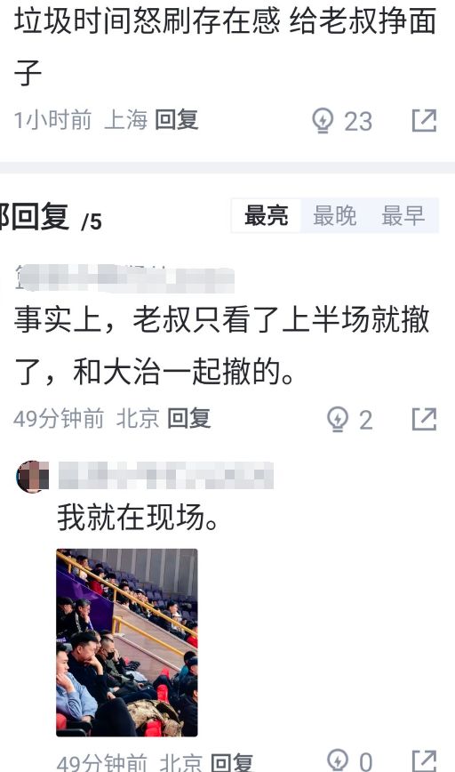 赛后有球迷给出了这样的评价:垃圾时间怒刷存在感,给老叔挣面子;随后有现场球迷在这条评论下方回复:事实上,老叔只看了上半场就撤了,和大郅一起撤的。并且还附带了现场拍的照片,说明这一场廖三宁表现确实太差,就连郭士强都没眼看了。