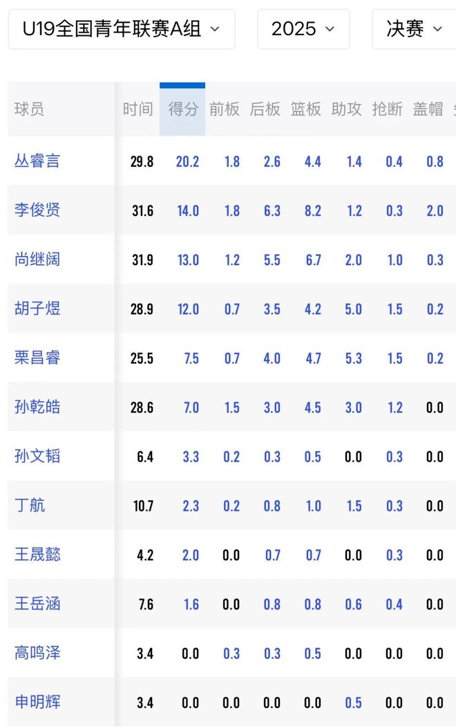 【主要球员数据】 丛睿言24分7篮板2盖帽 胡子煜23分9篮板7助攻2抢断 李俊贤12分10篮板2盖帽 栗昌睿7分2篮板2助攻2抢断 尚继阔5分6篮板 结束此次征程,青岛国信海天U19男篮将返回青岛,针对比赛暴露的问题继续打磨技战术,相信这支充满朝气的队伍未来可以创造更多佳绩! 青岛国信海天球员场均数据