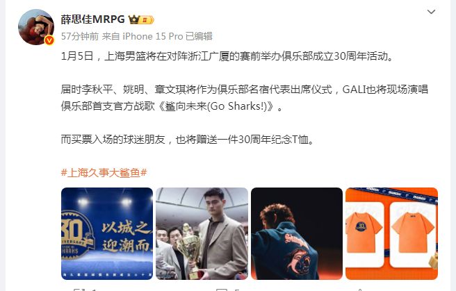薛思佳报道:“1月5日,上海男篮将在对阵浙江广厦的赛前,举办俱乐部成立30周年活动。届时李秋平、姚明、章文琪将作为俱乐部名宿代表出席仪式,GALI也将现场演唱俱乐部首支官方战歌《鲨向未来(Go Sharks!)》。” 上海男篮1996年1月正式建立,5月重返甲级行列,11月开始征战CBA联赛,并以常规赛第6名晋级季后赛。