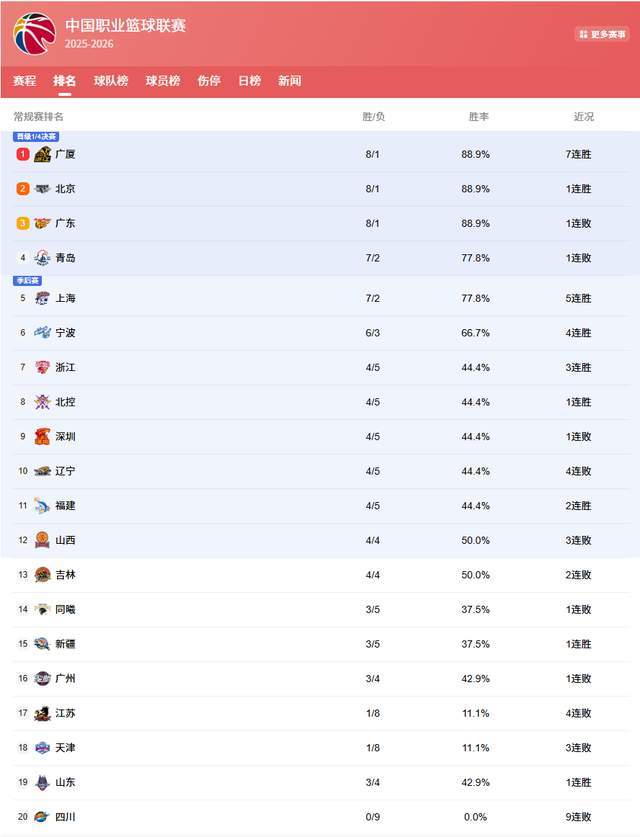 本轮其他比赛中,浙江队爆冷击败青岛队,以4胜5负的战绩悄然升至第七,成为季后赛席位的有力竞争者。而辽宁队则遭遇连败,排名跌至第十,跌出前八行列。黑马青岛队虽然输给浙江,但仍以7胜2负的战绩排在第四,成绩喜人,上海队同样战绩紧随其后。