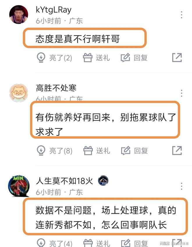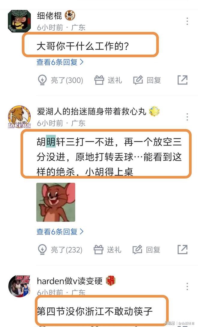 胡明轩糟糕的表现,赛后也遭到网友一致诟病。“大哥你干什么工作的?”;“胡明轩三打一不进,再一个放空三分没进,原地打转丢球…能看到这样的绝杀,小胡得上桌”;“第四节没你浙江不敢动筷子”;“态度是真不行啊轩哥”;“有伤就养好再回来,别拖累球队了,求求了”;“数据不是问题,场上处理球,真的连新秀都不如,怎么回事啊队长”;“不如上陈家政”;“不吹不黑,你现在和手帝一个级别”;“去去去打游戏去”……
