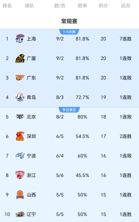 随着广厦22分输上海,广东遭浙江绝杀,CBA最新积分榜:榜首易主