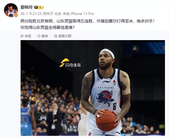 好像还不过瘾,随后,夏晓司老师再次发声,“两分险胜北京首钢,山东男篮取得五连胜,外援珀塞尔打得坚决,绝杀对手!你觉得山东男篮全场最佳是谁? ”