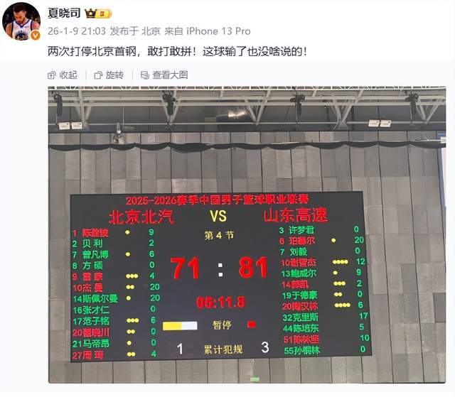 你以为这就完了吗?并没有!到了第四节,山东男篮一度81-71领先10分,夏晓司老师再次发声,“两次打停北京首钢,敢打敢拼!这球输了也没啥说的! ”