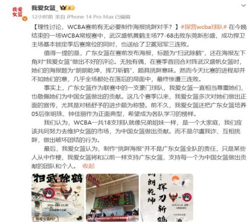 一场普通的WCBA常规赛却因为赛前海报遭到了争议:广东女篮在与武汉女篮的赛前海报内容为“扫武除鹤”,没想到却被对方击败,遭遇三连败。赛后,自媒体“我爱女篮”也对广东女篮的海报内容进行了反击。 “扫武除鹤”的意思,其实就是要要击败武汉女篮,这无论是在CBA还是WCBA的海报中,相似内容都很常见。 但是,广东女篮却在海报内容中写道:“你爱女篮吗?可能还是关怀还不够。”这明显就是在讥讽自媒体号“我爱女篮”了。 “我爱女篮”是武汉女篮发起的自媒体号,广东女篮将武汉女篮和“我爱女篮”自媒体号全部弄到一张海报上嘲讽,自然会引发对方的反击。
