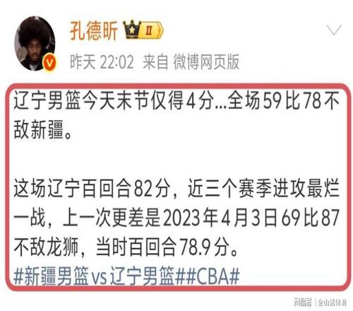 媒体人孔德昕社媒发文点评“辽宁男篮今天末节仅得4分...全场59比78不敌新疆。这场辽宁百回合82分,近三个赛季进攻最烂一战,上一次更差是2023年4月3日69比87不敌龙狮,当时百回合78.9分。”。