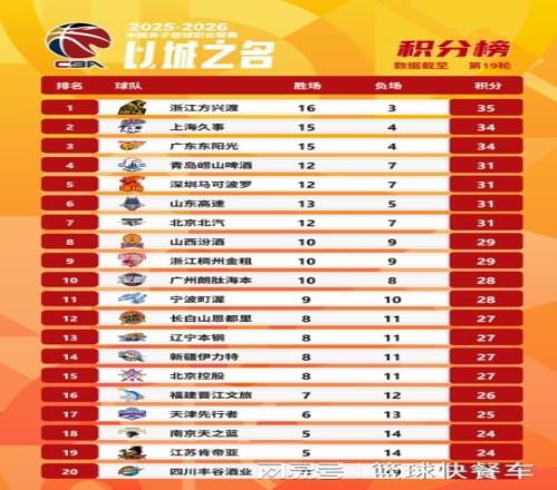 CBA积分榜最新排名出炉!广厦输球稳居第1:山西第8辽篮第13
