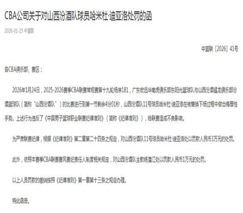 如今CBA官方开出罚单: CBA公司关于对山西汾酒队球员迪亚洛处罚的函 各CBA俱乐部、赛区: 2026年1月24日,2025-2026赛季CBA联赛常规赛第十九轮场序181,广东与山西的比赛进行到第一节剩余4分01秒,山西11号球员迪亚洛在被替换下场过程中做出侮辱性手势。上述行为违反《中国男子篮球职业联赛纪律准则》,给联赛造成不良影响。