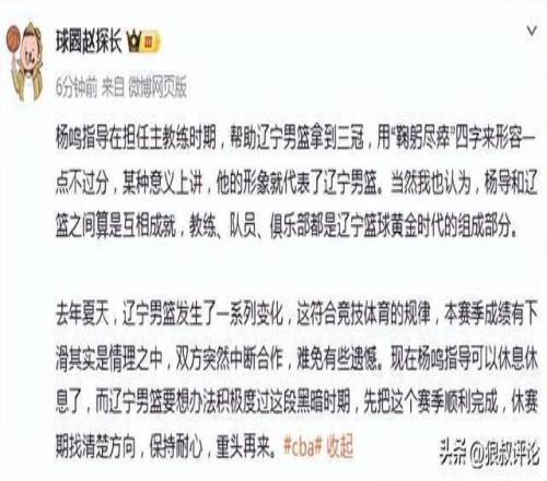 北京时间1月26日,根据辽宁男篮官方社媒公示,杨鸣因个人身体原因请辞,助教乌戈代理主教练职责。 随后,杨鸣社媒发文表示:最近球队的表现真心对不住球迷们的支持,让大家很失望,我非常内疚和惭愧,感谢所有队员们对我的支持,感谢俱乐部一直的信任。辽宁篮球一定会越来越好,加油。 不少球迷送出祝福,这一路你尽心竭力,问心无愧,故事已尽心,前路各安好,未来的路我会继续陪你走。 你真的做得很好!悟已往之不谏,知来者之可追。未来一切会越来越好,坚定地,不遗余力地相信杨鸣。 对于为何杨鸣选择离开辽篮主帅的位置,实际上与一波4连败存在直接的关系,尤其是昨晚59-78不敌新疆,辽宁第四节只得到4分,成为压垮杨鸣最后一根稻草。 59分,这是辽篮队史单场第二低。最低是56分,那还是遥远的97-98赛季,1998年3月25日,辽篮曾客场56-90惨败八一! 媒体人赵探长发文点评:杨鸣指导在担任主教练时期,帮助辽宁男篮拿到三冠,用“鞠躬尽瘁”四字来形容一点不过分,某种意义上讲,他的形象就代表了辽宁男篮。当然我也认为,杨导和辽篮之间算是互相成就,教练、队员、俱乐部都是辽宁篮球黄金时代的组成部分。 去年夏天,辽宁男篮发生了一系列变化,这符合竞技体育的规律,本赛季成绩有下滑其实是情理之中,双方突然中断合作,难免有些遗憾。现在杨鸣指导可以休息休息了,而辽宁男篮要想办法积极度过这段黑暗时期,先把这个赛季顺利完成,休赛期找清楚方向,保持耐心,重头再来。 |