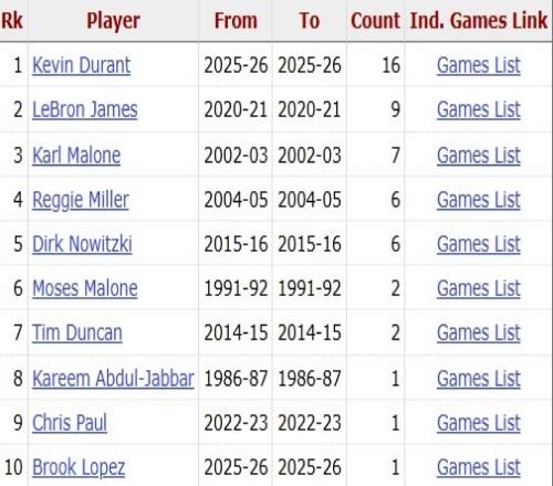 球员生涯第18个赛季30+场次:杜兰特17次詹姆斯9次马龙7次