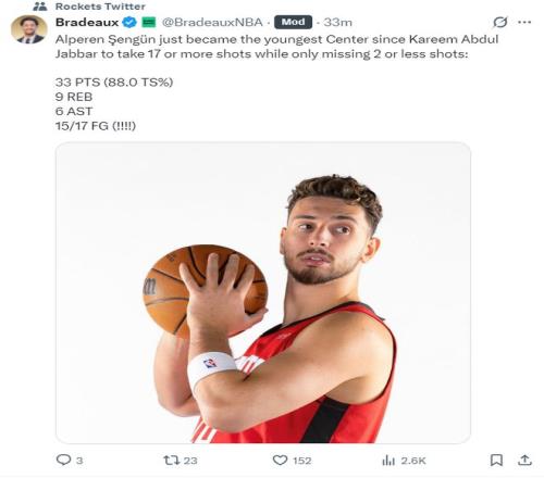 这场比赛申京17中15的表现也引发了休斯顿媒体的热议,他也一战创造多项纪录: 1.申京成为贾巴尔后最年轻出手至少17次仅丢2球的中锋;