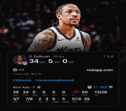 此役国王前锋德罗赞打了39分钟26投13中,三分7中1、罚球8中7拿到34分5篮板,正负值-17,没有送出助攻!