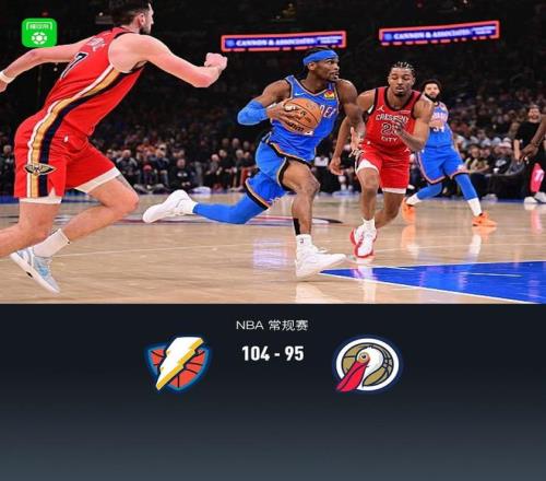 第一节雷霆迪昂拿下4分,鹈鹕德里克-奎因拿下4分,首节战罢雷霆17-14领先鹈鹕 第二节雷霆亚历山大拿下9分,鹈鹕锡安-威廉森拿下6分,半场结束雷霆48-46领先鹈鹕 第三节雷霆霍姆格伦拿下14分,鹈鹕锡安-威廉森拿下7分,第三节结束雷霆79-69领先鹈鹕 第四节雷霆亚历山大拿下10分,鹈鹕锡安-威廉森拿下8分,最终雷霆104-95战胜鹈鹕