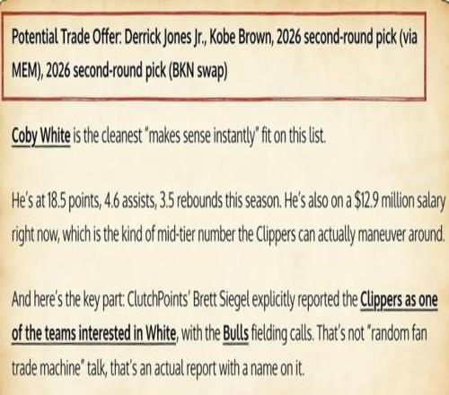 然而,要想延续当前的状态,成功拿到季后赛资格甚至冲击总冠军,快船的阵容深度显然不够。他们还需要在交易截止日前引入一些有实力的拼图。 美媒《Fadeaway World》撰文建议,快船可以将小琼斯、科比·布朗、2026年的次轮签(来自灰熊)、2026年的次轮签(篮网互换)打包送到公牛,换回后卫科比·怀特。