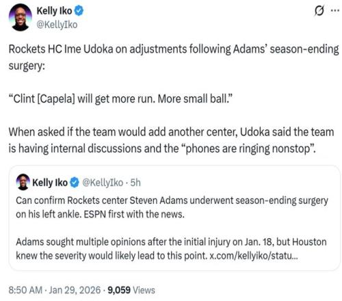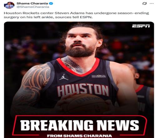 亚当斯报销 消息最先由ESPN名记Shams曝出,亚当斯左脚踝接受手术,确定赛季报销。随后火箭队官方确认消息真实性。