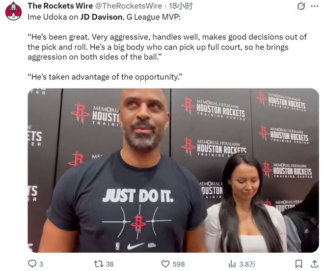 火箭主帅乌度卡的一段 3 分钟采访,让双向合同球员 JD - 戴维森意外成了焦点。“我在凯尔特人带过他,太了解了!决策明智、进攻有侵略性、挡拆判断精准,攻防两端都够狠!” 乌度卡几乎把所有赞美都给了这位 22 岁的控卫,要知道,戴维森此前还只是火箭阵中不起眼的双向球员,如今却因范乔丹的伤停,迎来了冲击轮换的绝佳机会。
