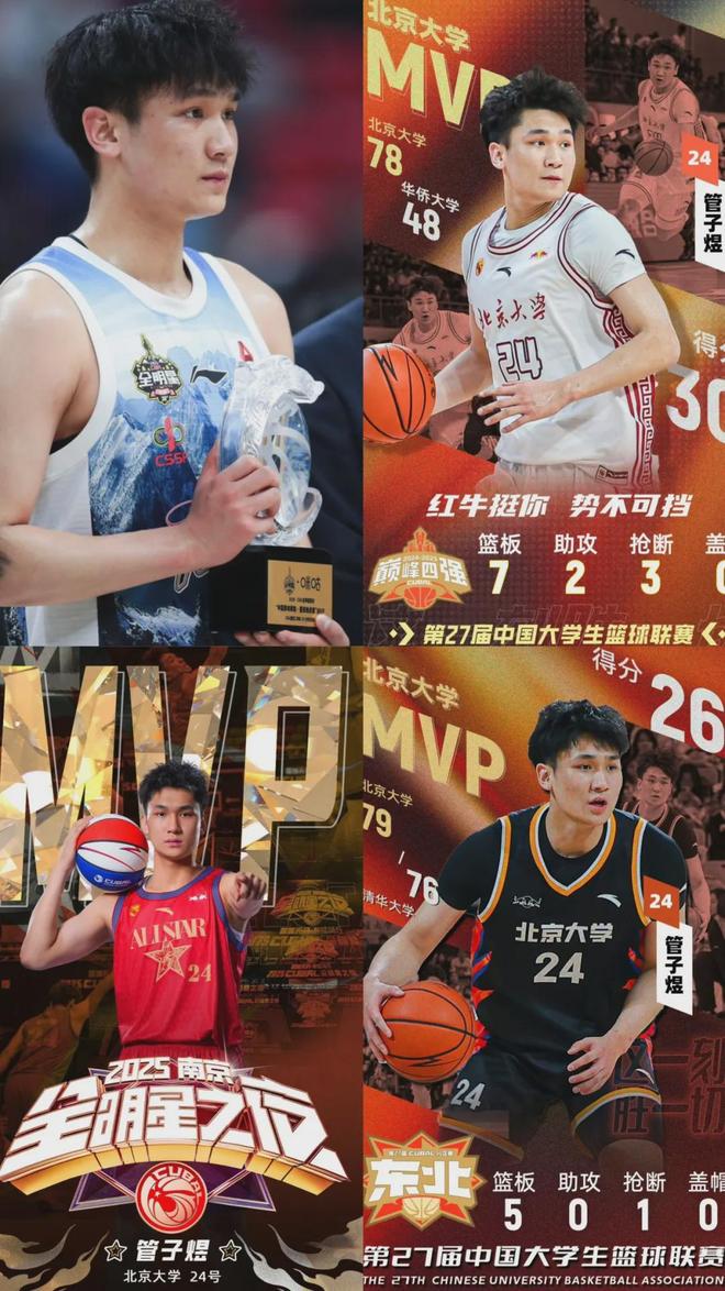 在今年CBA全明星周末的星锐挑战赛上,管子煜作为大学生联队的绝对核心,全场独得19分8篮板,捧起CBA全明星周末星锐赛的MVP奖杯。