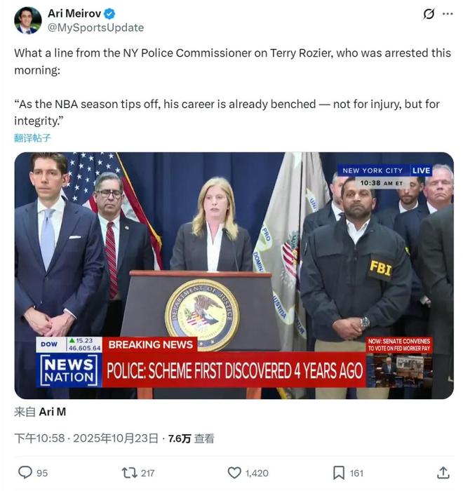 在FBI发布会召开后不久,NBA官方就比卢普斯、罗齐尔被逮捕一事发布官方声明,勒令两人立即从所属球队离职,“我们正在对今日公布的联邦起诉书进行回顾,特里·罗齐尔与昌西·比卢普斯即日起被要求离队暂停职务,我们将继续配合相关当局调查。”NBA在声明中表示,“我们以最严肃的态度对待这些指控,维护比赛公正性始终是我们的首要任务”,对于比卢普斯的突发事故,波特兰开拓者队也在第一时间发表了官方声明,表示已经知晓相关指控内容,将全力配合调查,与此同时,助理教练斯普利特将担任球队的临时主教练