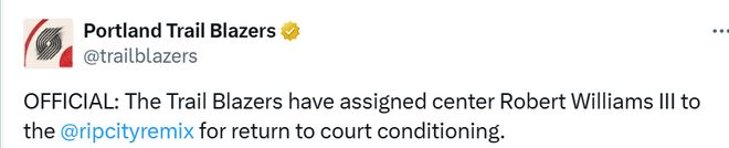 北京时间10月28日,开拓者官方宣布,已将中锋罗伯特-威廉姆斯三世下放到其发展联盟附属球队,以进行重返赛场的体能调整。这意味着罗威已经接近复出,对于本来场均上场时间就很少的杨瀚森而言,这一消息可能意味着他更没机会出场了。