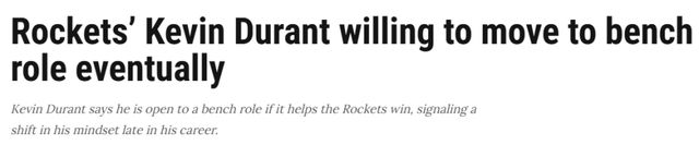 “当然愿意。如果我所在的球队实力强劲,而我也意识到自己不再有能力担任首发,那我会接受替补角色,”杜兰特在播客节目中说道,“我不觉得这种情况会发生,但我只是客观表达我的态度。我想成为优秀球队的一份子,所以如果未来真的出现这样的场景,且我清楚‘是时候退居替补’了,那么我相信自己也能胜任这个角色。”