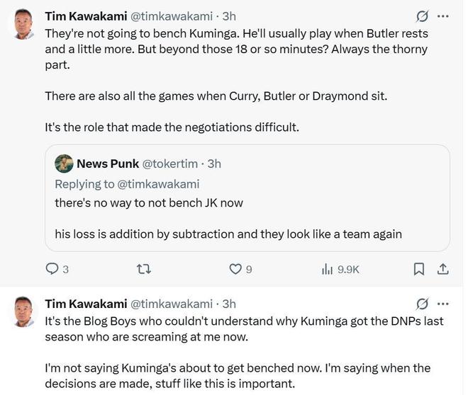 细节三:库明加不打勇士也很出色 受困于伤病问题,库明加本场继续缺阵,但并不影响勇士继续交出亮眼表现。 正如赛后勇士队记Tim Kawakami所说,库明加很好,但当他不在时勇士也很出色。 勇士队管理层显然也意识到了这一点,相信这两场比赛会让勇士队下定一些决心。