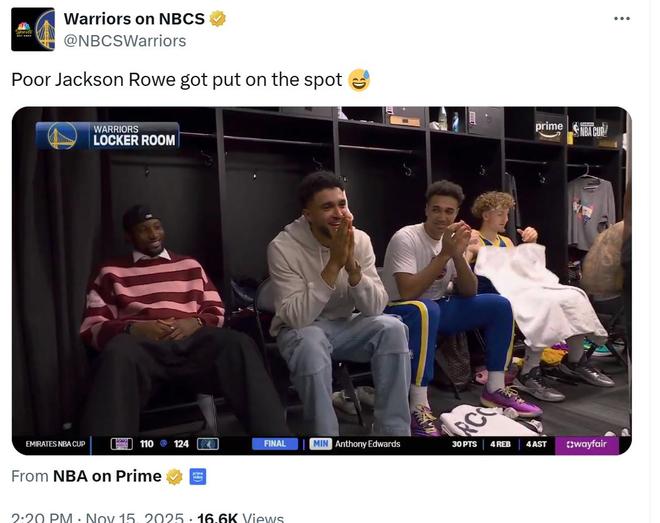 细节二:追梦暖心一幕 在库里称赞全队后,另外一名老将追梦又在赛后更衣室的全美采访中送上暖心一幕。 赛后科尔让追梦安排一名球员接受采访,追梦犹豫期间,科尔已经想点名近来风头正盛的理查兹,结果追梦思考了一会后选择了球队中戏份最少的杰克逊-罗,并且不忘虚晃一下先点名理查兹。 突然被点名的杰克逊-罗受宠若惊,面对全美直播的镜头腼腆说道:“额,上帝保佑过库里。”