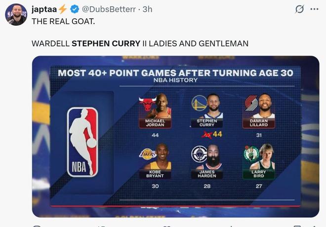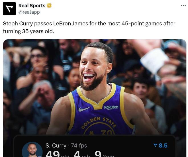 而在轰下49分之前,库里前一场比赛已经拿下46分,这让库里成为NBA历史上第二位在37岁后能够连续两场轰下45+得分的球员,另外一人是乔丹,也是NBA历史上连续两场砍下至少46分最老的球员。